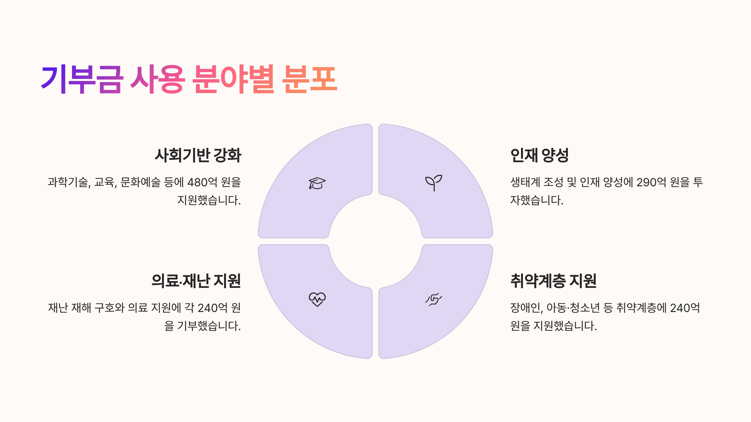 | 2023 | 취약계층 아동, 청소년, 교육 분야 집중 지원 | 수백억 원 규모 |