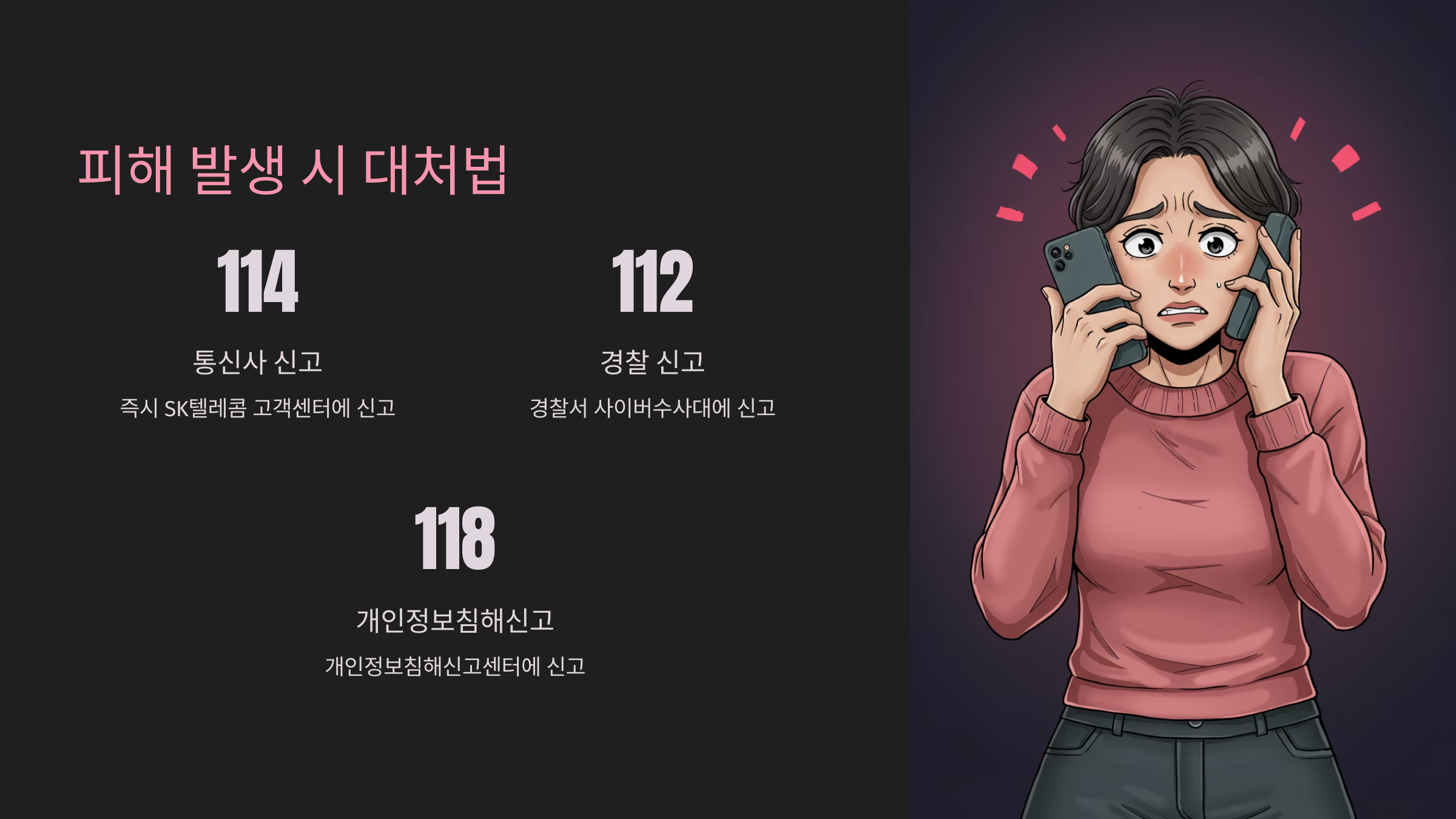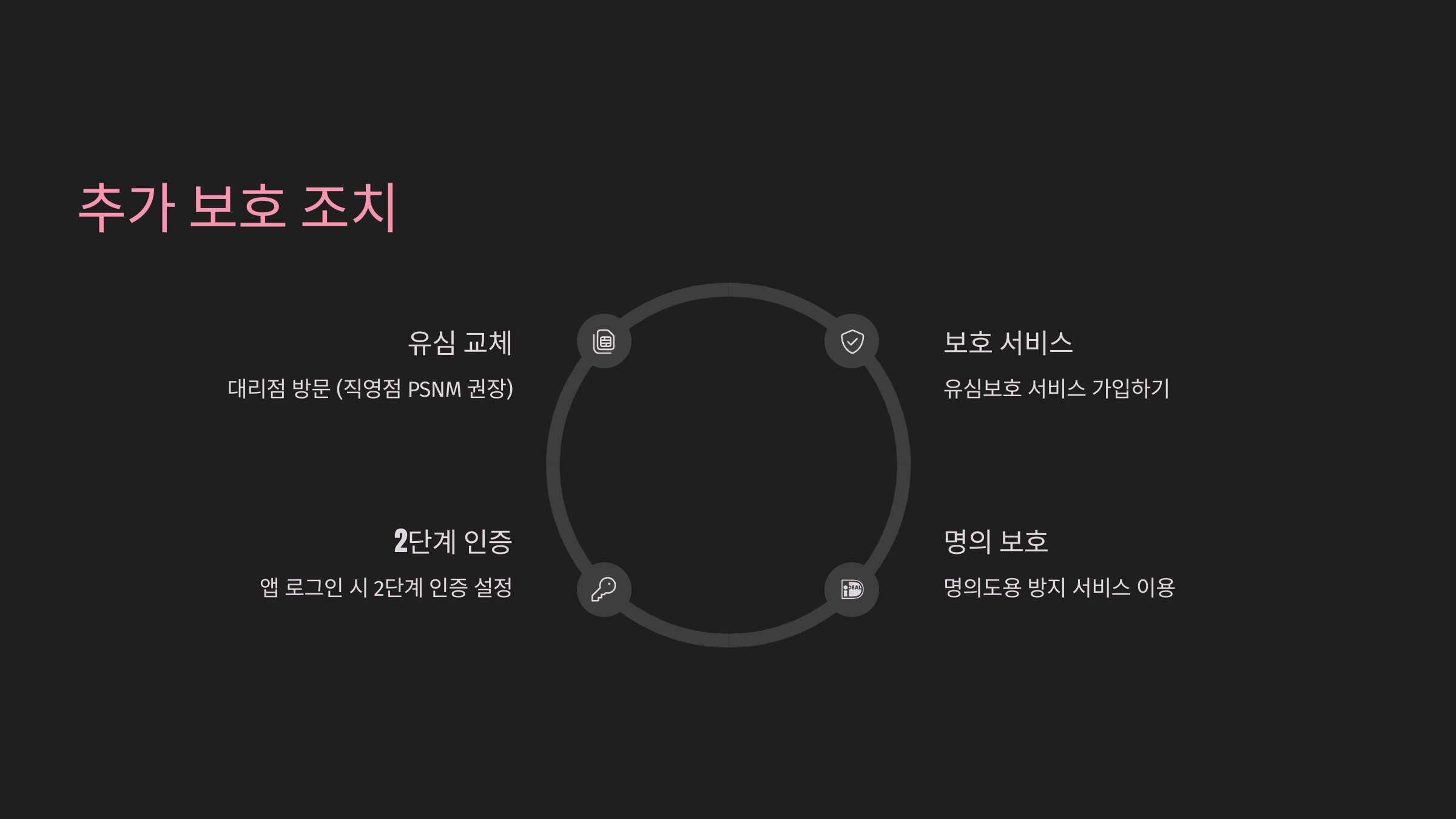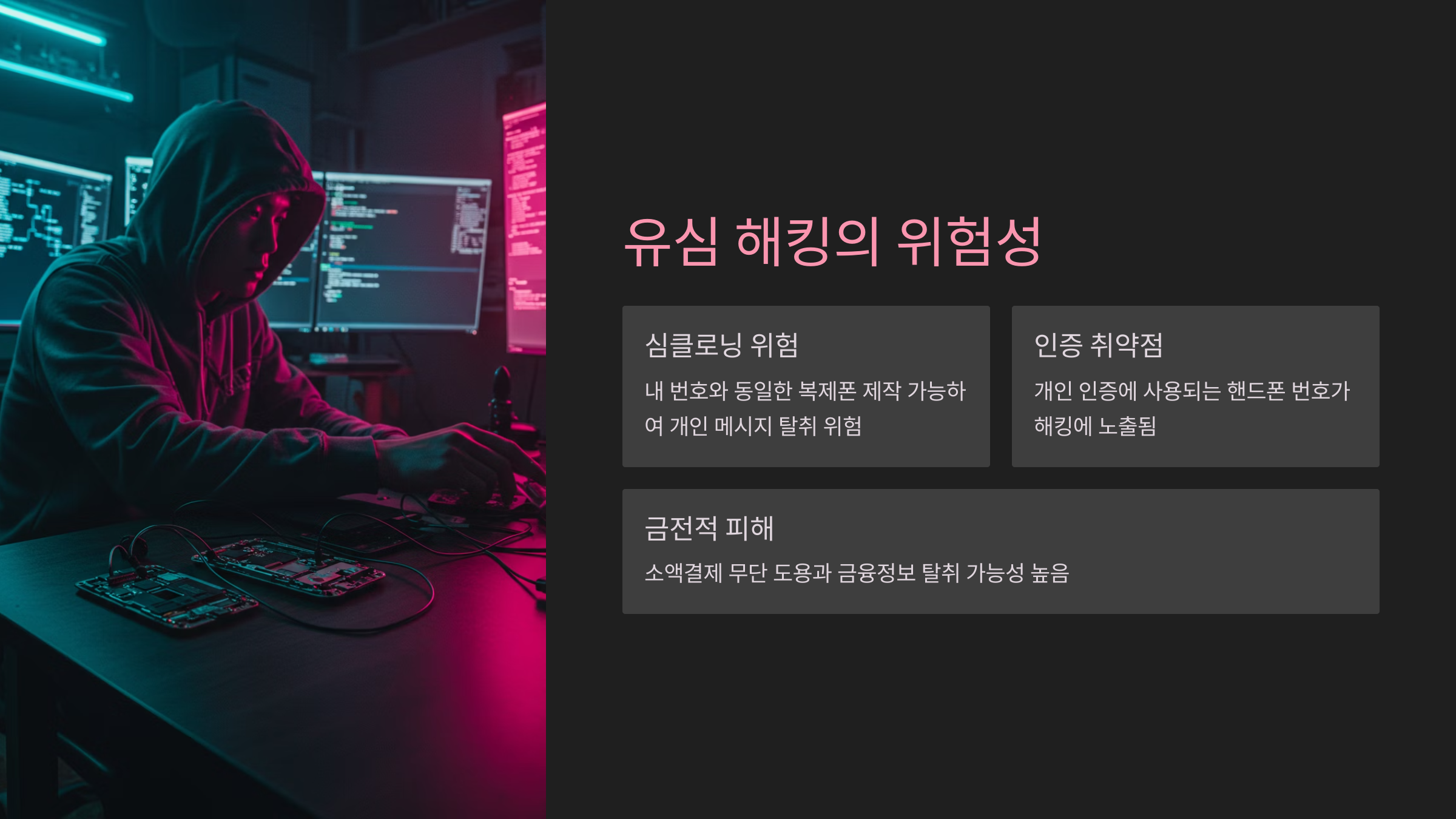 🚨 유심 복제(SIM Swapping): 해커가 유출된 정보로 유심카드를 복제해 여러분의 전화번호로 오는 메시지를 가로챌 수 있습니다.